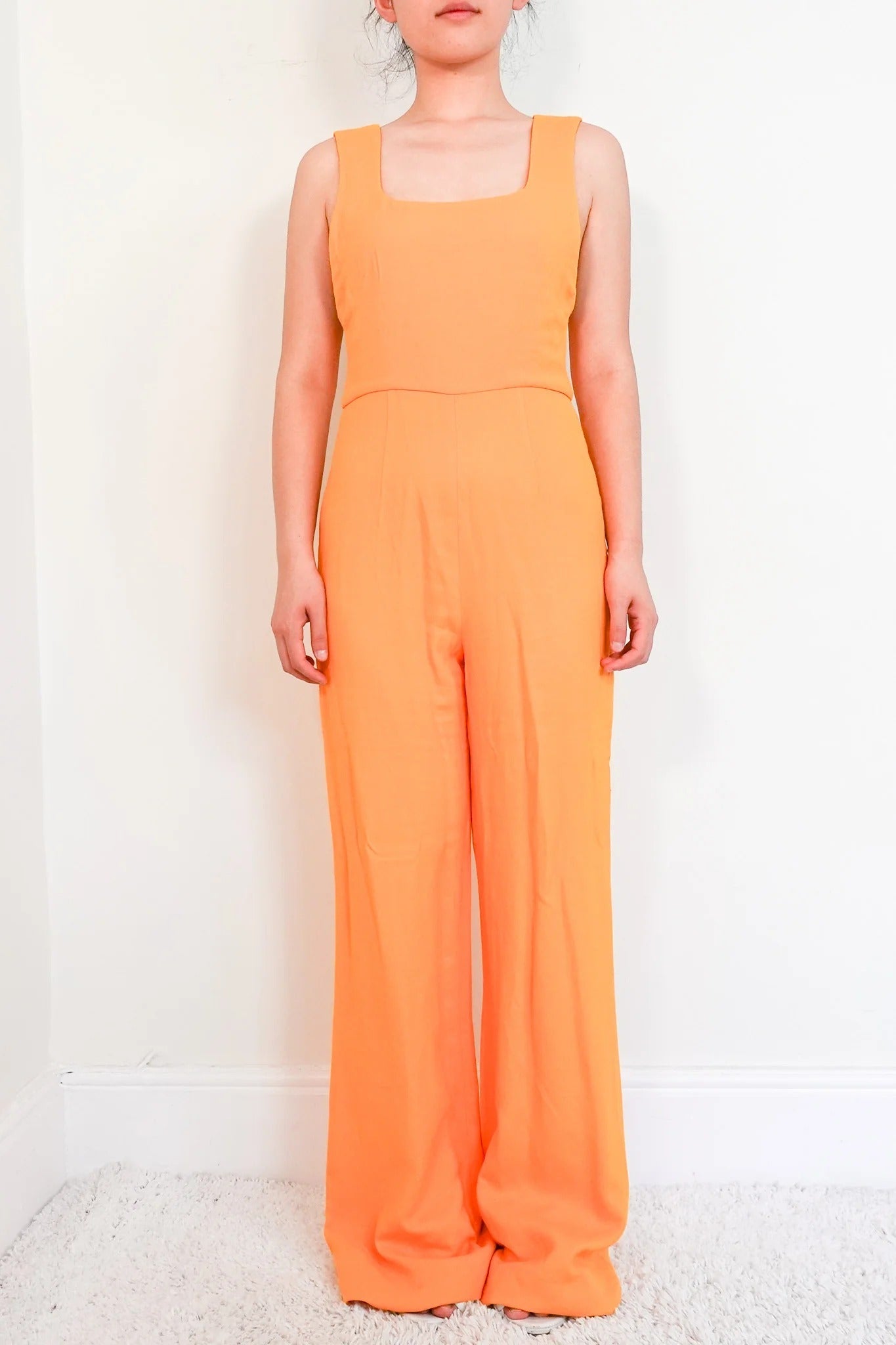 This exotic orange maxi jumpsuit by features a square neck and full-length trouser legs. The back has a v shaped lower cut, making this strappy sleeved garment perfect for a sunny summers day. Fully lined with zip at the centre back.
